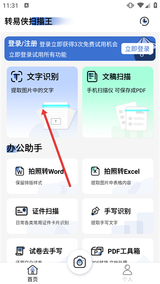 1、在【轉(zhuǎn)易俠掃描王】首頁(yè),點(diǎn)擊【文字識(shí)別】功能選項(xiàng),可進(jìn)入對(duì)應(yīng)操作界面,該功能用于提取圖片中的文字。