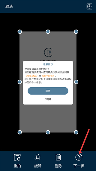 3、導(dǎo)入圖片后出現(xiàn)溫馨提示彈窗,點(diǎn)擊【同意】相關(guān)協(xié)議后,再點(diǎn)擊底部的【下一步】按鈕推進(jìn)文字識(shí)別流程。