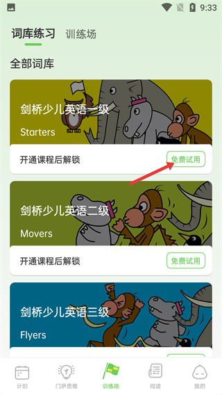 1、進(jìn)入訓(xùn)練場的詞庫練習(xí)頁面,選擇目標(biāo)課程,點(diǎn)擊課程對應(yīng)的【免費(fèi)試用】按鈕,進(jìn)入該課程的專屬學(xué)習(xí)頁面。