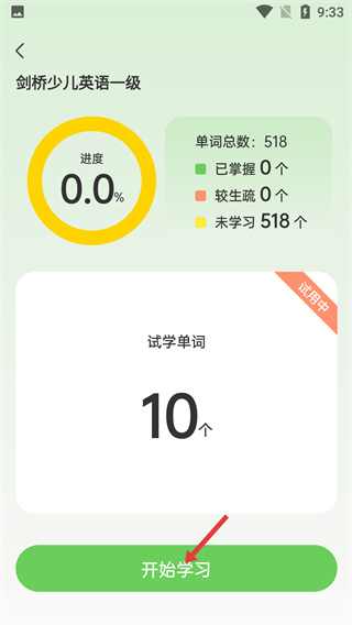 2、進(jìn)入課程學(xué)習(xí)頁面后,可查看單詞掌握進(jìn)度,點(diǎn)擊【開始學(xué)習(xí)】按鈕,啟動(dòng)試學(xué)單詞的練習(xí)流程。