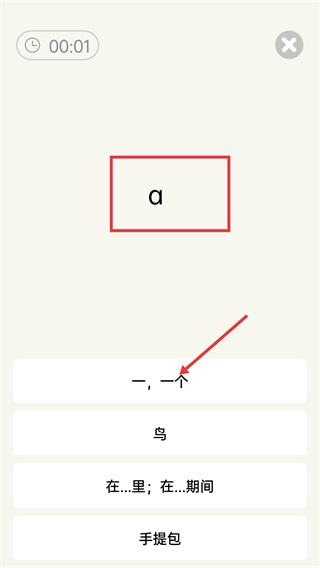 3、進(jìn)入單詞練習(xí)環(huán)節(jié),根據(jù)頁面展示的目標(biāo)單詞,選擇對應(yīng)的正確釋義選項(xiàng),完成該單詞的練習(xí)任務(wù)。