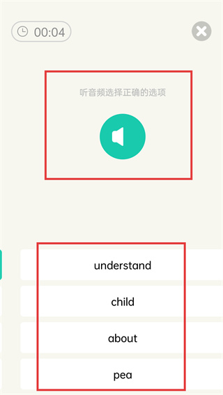4、進(jìn)入聽音頻練習(xí)環(huán)節(jié),點(diǎn)擊音頻播放按鈕獲取內(nèi)容,根據(jù)聽到的信息,選擇對應(yīng)的正確單詞選項(xiàng),完成該輪聽力練習(xí)。