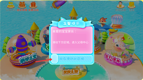 2、在彈出的溫馨提示彈窗中,向右滑動(dòng)下方的“向右滑動(dòng)此區(qū)域”板塊,完成驗(yàn)證并進(jìn)入父母中心頁(yè)面。