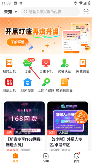 1、在首頁界面,點擊【訂座】功能入口,可進入網(wǎng)吧篩選頁面開展訂座操作。