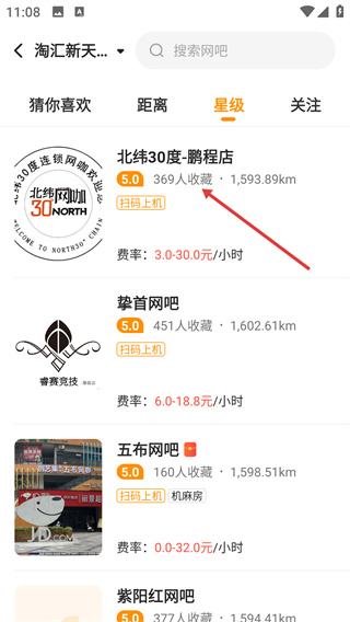 3、在星級排序后的列表中,可查看各種評分的網(wǎng)吧,選擇目標網(wǎng)吧進入詳情頁。