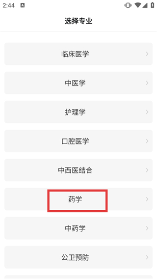 1、在選擇專業(yè)頁面,點擊【藥學(xué)】選項,即可選定該專業(yè),進(jìn)入適配該專業(yè)的學(xué)習(xí)及題庫相關(guān)界面。