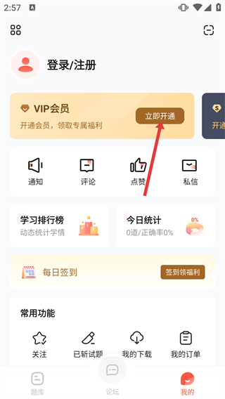 2、在題庫頁面,點擊底部導(dǎo)航欄的【我的】按鈕,可進(jìn)入包含登錄-注冊、會員權(quán)益等功能的個人中心頁面。