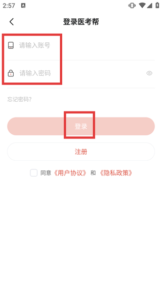 4、在登錄醫(yī)考幫頁面,填寫【請輸入賬號】和【請輸入密碼】,勾選協(xié)議后點擊【登錄】按鈕完成賬號登錄。
