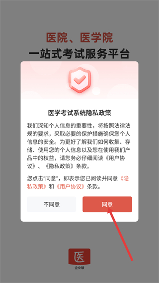 1、在醫(yī)學(xué)考試系統(tǒng)的隱私政策彈窗中,閱讀《隱私政策》《用戶協(xié)議》后,點(diǎn)擊【同意】按鈕即可進(jìn)入后續(xù)登錄界面。