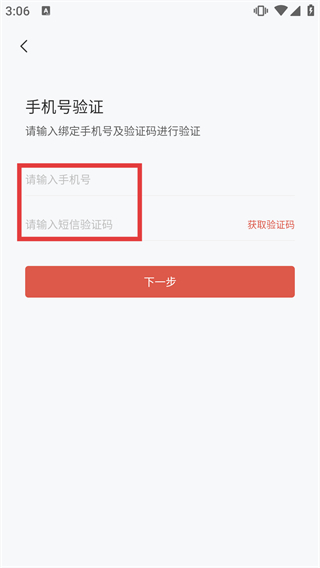 3、進(jìn)入手機(jī)號(hào)驗(yàn)證頁(yè)面,需依次填寫【請(qǐng)輸入手機(jī)號(hào)】和獲取的【請(qǐng)輸入短信驗(yàn)證碼】,準(zhǔn)備完成驗(yàn)證。