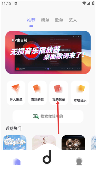 1、在軟件主界面,找到【我的歌單】選項,它處于【導(dǎo)入歌單】-【喜歡的歌】-【本地音樂】旁,點擊可進入歌單管理頁面。