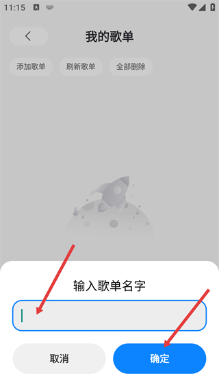 3、觸發(fā)新建歌單操作后,在彈出的【輸入歌單名字】輸入框中填寫內(nèi)容,完成后點擊【確定】按鈕來完成歌單創(chuàng)建。