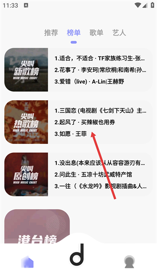 1、在軟件【榜單】頁(yè)面,找到【尖叫熱歌榜】選項(xiàng),點(diǎn)擊該榜單可進(jìn)入其對(duì)應(yīng)的歌曲列表頁(yè)面,查看榜單內(nèi)的音樂(lè)內(nèi)容。