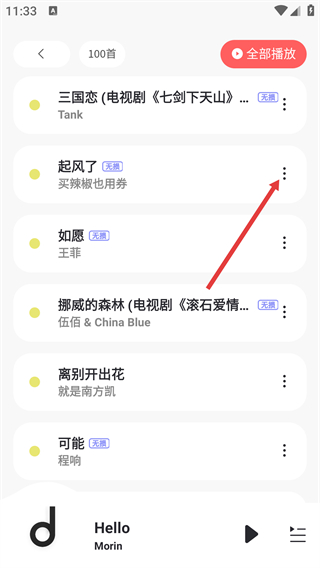 2、進(jìn)入榜單歌曲列表頁(yè)后,可點(diǎn)擊右上角【全部播放】播放所有歌曲,也可點(diǎn)擊單首歌右側(cè)的三點(diǎn)按鈕,打開操作菜單。
