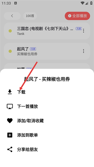 3、點(diǎn)擊單首歌右側(cè)三點(diǎn)按鈕后,在彈出的菜單中可選擇【下載】-【添加到歌單】等操作,實(shí)現(xiàn)對(duì)該歌曲的管理。