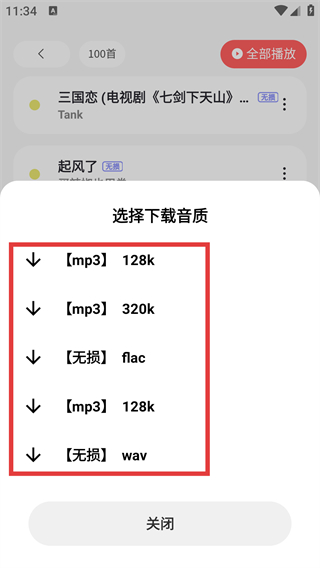 4、選擇【下載】操作后,會(huì)彈出【選擇下載音質(zhì)】彈窗,可從中挑選【mp3-128k】【無(wú)損-flac】等音質(zhì)來(lái)下載歌曲。