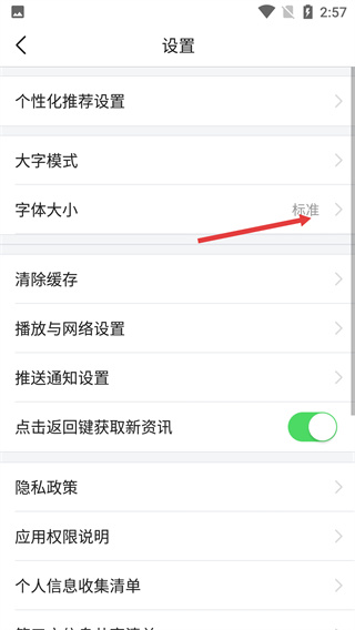 3、進入設置頁面,找到【字體大小】選項,點擊該選項可進入字體大小的調(diào)整預覽界面。