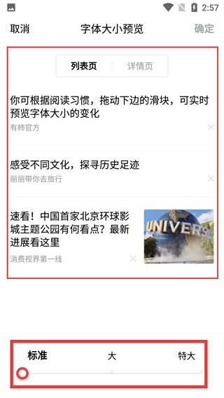 4、在字體大小預覽界面,可切換【列表頁】/【詳情頁】預覽,拖動滑塊選標準/大/特大字體,選后點【確定】生效。