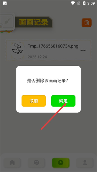 4、在彈出的“是否刪除該畫畫記錄?”確認(rèn)彈窗中,點擊【確定】按鈕,即可完成該條畫畫記錄的刪除操作。