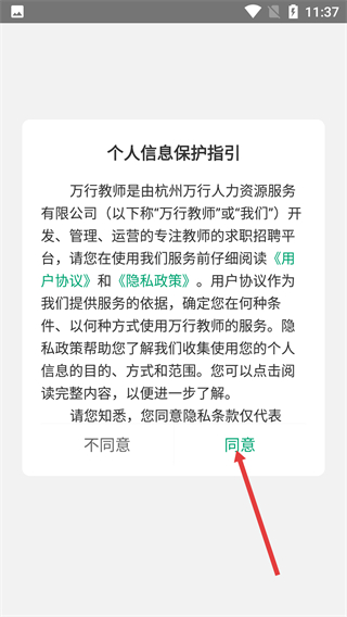 1、在【個人信息保護(hù)指引】頁面,點(diǎn)擊【同意】按鈕,確認(rèn)《用戶協(xié)議》與《隱私政策》,進(jìn)入應(yīng)用的職位列表界面。