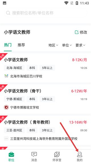 2、進(jìn)入職位列表頁面后,點(diǎn)擊底部導(dǎo)航欄的【我的】選項(xiàng),進(jìn)入包含個人信息、常用功能的個人中心頁面。