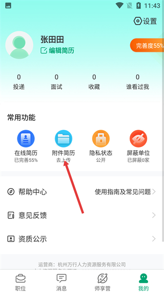 3、在個人中心的常用功能區(qū)域,點(diǎn)擊【附件簡歷】選項(xiàng),進(jìn)入附件簡歷的上傳準(zhǔn)備頁面。