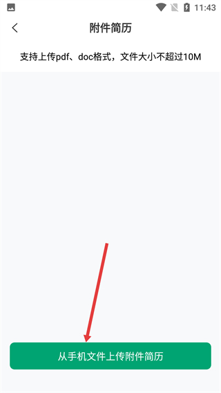4、進(jìn)入【附件簡歷】頁面后,點(diǎn)擊【從手機(jī)文件上傳附件簡歷】按鈕,啟動簡歷文件的上傳流程。