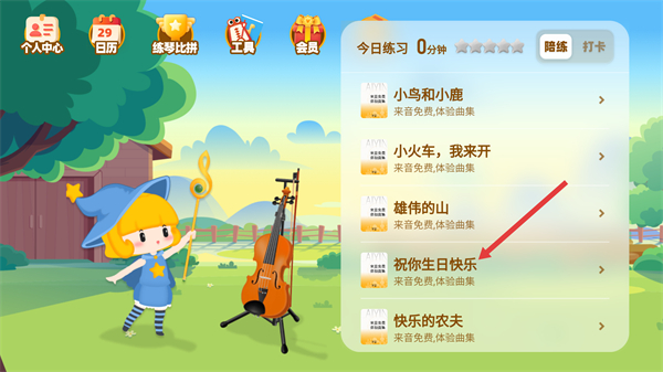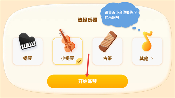 1、在樂器選擇界面選中【小提琴】后,點(diǎn)擊【開始練琴】按鈕,進(jìn)入包含多首曲目的練琴曲目選擇頁(yè)面。