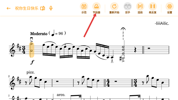 3、進(jìn)入【祝你生日快樂】的樂譜界面后,點(diǎn)擊頂部的【節(jié)拍器】按鈕,調(diào)出節(jié)拍器的參數(shù)設(shè)置控件。
