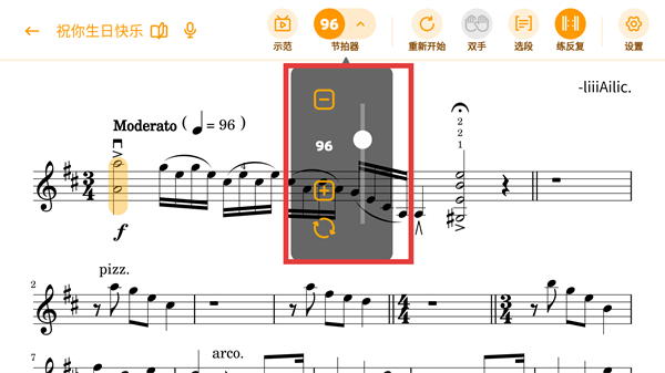 4、通過調(diào)出的節(jié)拍器控件,可調(diào)整節(jié)拍相關(guān)參數(shù),借助該功能輔助完成當(dāng)前曲目的練琴練習(xí)。
