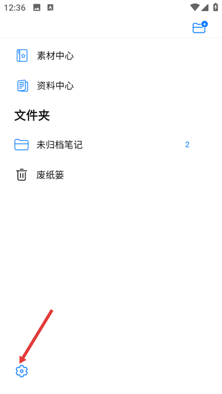 1、在含【素材中心】【資料中心】的頁面,點擊左下角設(shè)置圖標(biāo),進(jìn)入包含多類功能選項的設(shè)置頁面。