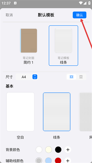 4、在默認(rèn)模板選擇界面選好模板后,點擊右上角【確認(rèn)】按鈕,完成筆記默認(rèn)模板的設(shè)置。