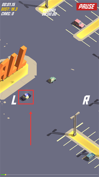 2、操控【警車】在道路中躲避車輛,左上角會顯示【DIST-19.3】等數(shù)據(jù),持續(xù)存活可積累距離與分數(shù)。