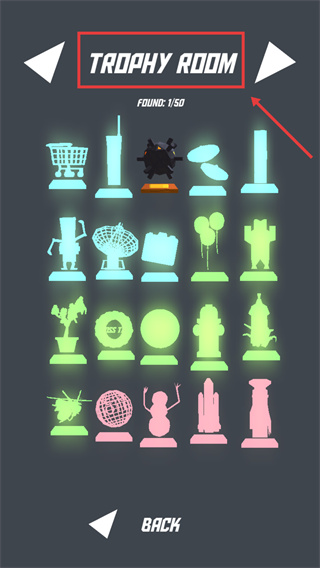 4、收集道具可解鎖【TROPHY-ROOM】中的獎杯,當前進度為【FOUND-1/50】,持續(xù)挑戰(zhàn)可解鎖更多藏品。