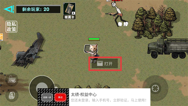 2、進(jìn)入場(chǎng)景后優(yōu)先拾取物資,看到可交互物品點(diǎn)擊【打開(kāi)】獲取資源,同時(shí)注意【剩余玩家-20】的生存競(jìng)爭(zhēng)壓力。