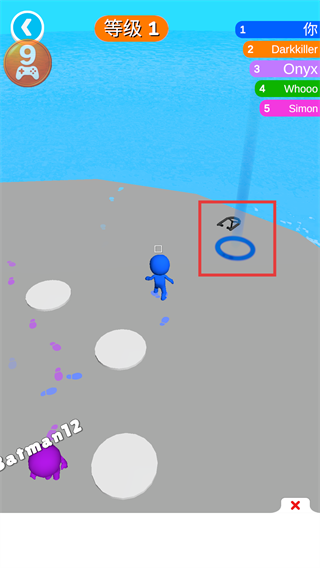 2、進(jìn)入關(guān)卡后,拾取場(chǎng)景中的道具(如藍(lán)色圓環(huán)),可增強(qiáng)角色能力,提升亂斗中的競(jìng)爭(zhēng)力。
