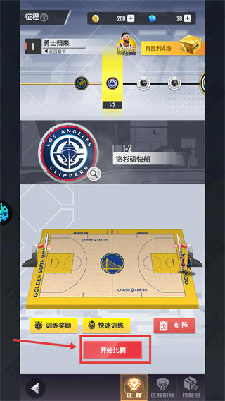 1、在【征程】界面選擇【1-2】關(guān)卡對應(yīng)對手【洛杉磯快船】,點擊【開始比賽】進入對局。