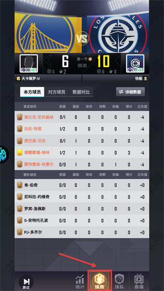 2、比賽中點擊【球員】選項查看己方球員數(shù)據(jù),關(guān)注投籃-籃板等指標,根據(jù)正負值調(diào)整輪換,提升對局表現(xiàn)。