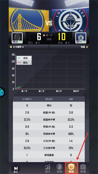 3、切換至【球隊】界面查看雙方統(tǒng)計數(shù)據(jù),對比投籃命中率-罰球命中率等差異,針對性調(diào)整戰(zhàn)術(shù)彌補短板。