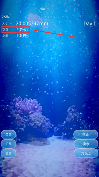 2、水母的動作真實靈動又可愛,通過屏幕“大小”欄可實時觀測成長動態(tài),饑餓值、水質(zhì)、養(yǎng)育天數(shù)等關(guān)鍵信息清晰直觀地展露。