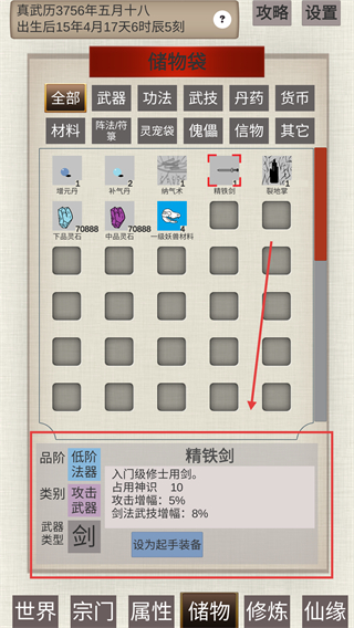 2、打開【儲(chǔ)物袋】找到【精鐵劍】,點(diǎn)擊設(shè)為起手裝備,提升攻擊與劍法武技增幅,增強(qiáng)戰(zhàn)斗能力。