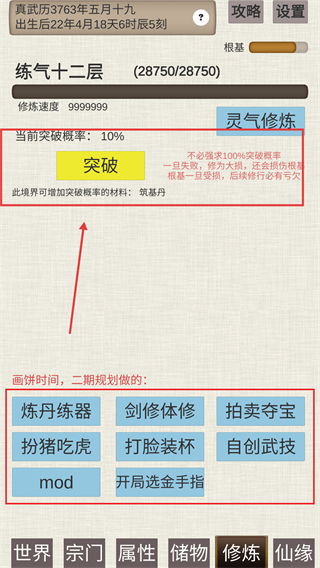 3、在練氣十二層時(shí),使用【筑基丹】提升突破概率,點(diǎn)擊【突破】按鈕嘗試進(jìn)階筑基期避免根基受損。