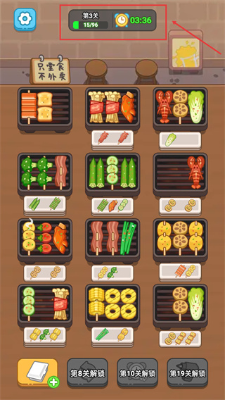 2、關(guān)注進度條變化,當(dāng)前15/96需持續(xù)匹配燒烤食材,同時注意倒計時,合理規(guī)劃操作節(jié)奏以推進關(guān)卡。