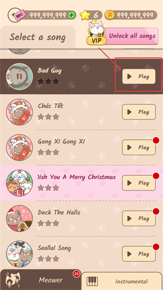 2、在【Bad-Guy】關(guān)卡界面,點擊右側(cè)帶【25】標識的音樂圖標,可觸發(fā)歌曲相關(guān)的切換選項。