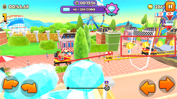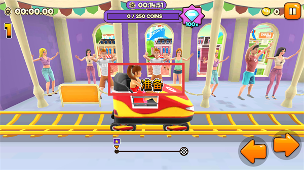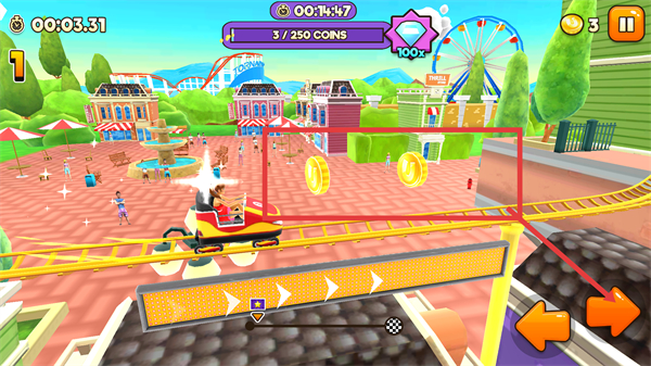 2、在主題公園場(chǎng)景中,過山車行駛時(shí)會(huì)遇到【金幣】,需通過【方向鍵】控制移動(dòng)方向,收集沿途金幣。