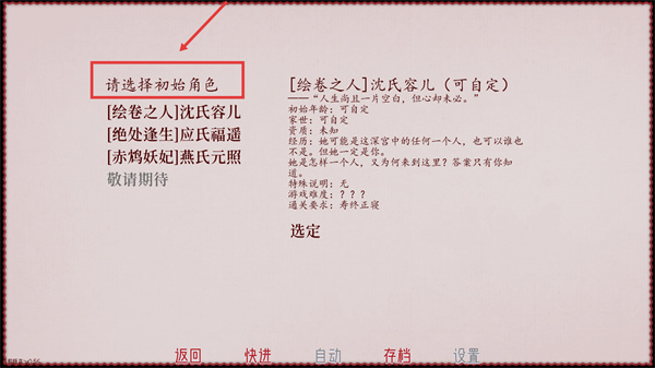 1、在【請(qǐng)選擇初始角色】界面,可自選如【[繪卷之人]沈氏容兒】的角色,其家世、年齡等屬性支持自定義。