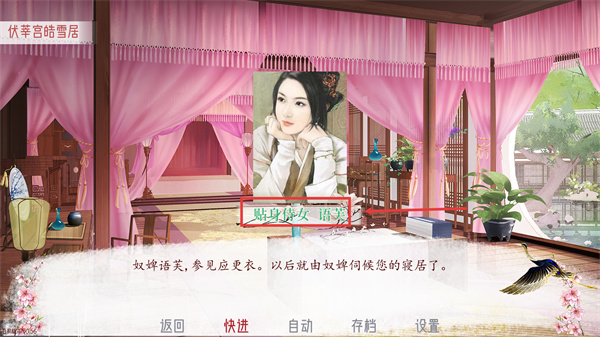3、在【伏莘宮皓雪居】中,與【貼身侍女-語(yǔ)芙】完成對(duì)話,解鎖寢宮相關(guān)的服務(wù)與互動(dòng)功能。