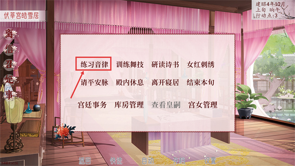 4、利用【行動(dòng)點(diǎn)】選擇【練習(xí)音律】等行為,提升角色屬性,同時(shí)可通過其他選項(xiàng)處理宮廷事務(wù)。