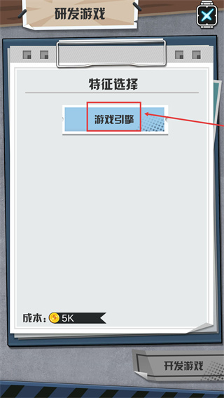 3、選擇【游戲引擎】等核心特征,消耗對應(yīng)成本后點(diǎn)擊【開發(fā)游戲】推進(jìn)制作。