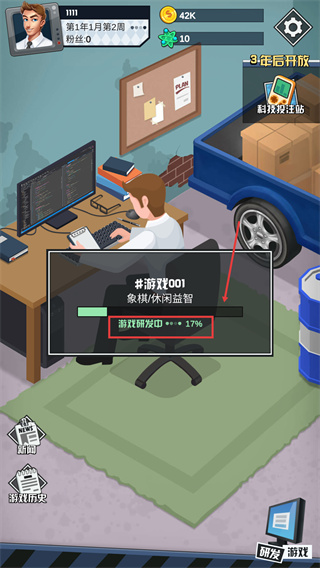 4、返回主界面可查看游戲研發(fā)進(jìn)度(如17%),等待研發(fā)完成后可獲取收益、積累粉絲,推進(jìn)工作室發(fā)展。